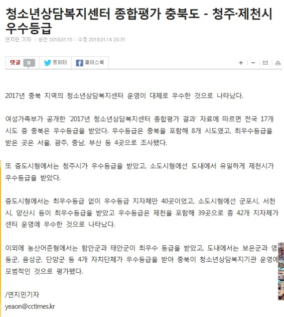 청소년상담복지센터 종합평가 충북도 - 청주·제천시 우수등급 페이지 정보 작성자 운영자 댓글 0건 조회 3,755회 작성일 18-04-02 14:07 본문 청소년상담복지센터 종합평가 충북도 - 청주·제천시 우수등급 목록 이전글위기 청소년 및 학교 밖 청소년 발굴 위한 연합캠페인 실시 18.06.05 다음글제천시청소년지원센터 꿈드림 검정고시 준비반 참가자 모집 18.02.05 댓글목록 댓글목록 등록된 댓글이 없습니다.