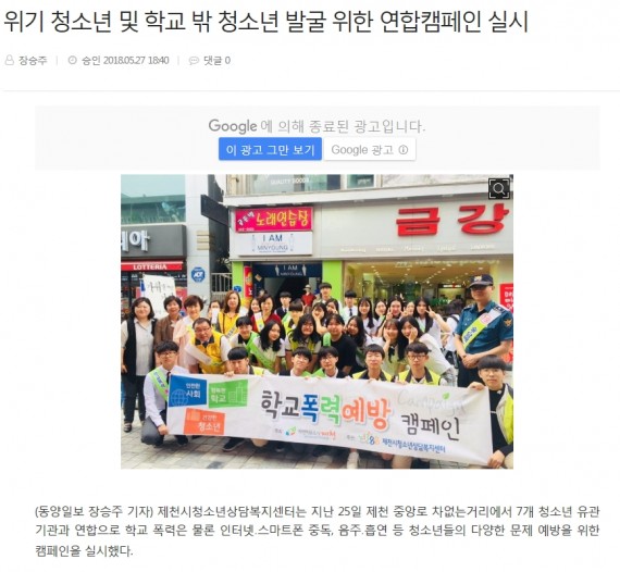 위기 청소년 및 학교 밖 청소년 발굴 위한 연합캠페인 실시 페이지 정보 작성자 운영자 댓글 0건 조회 3,709회 작성일 18-06-05 11:46 본문 위기 청소년 및 학교 밖 청소년 발굴 위한 연합캠페인 실시 목록 이전글제천 위기 청소년 및 학교 밖 청소년 위한 연합캠페인 실시 18.06.05 다음글청소년상담복지센터 종합평가 충북도 - 청주·제천시 우수등급 18.04.02 댓글목록 댓글목록 등록된 댓글이 없습니다.