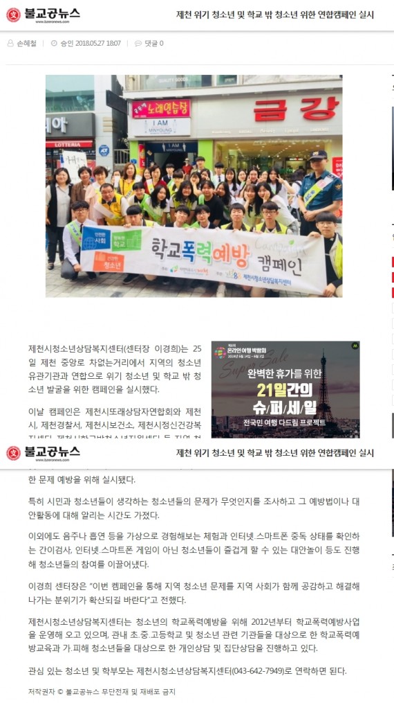 제천 위기 청소년 및 학교 밖 청소년 위한 연합캠페인 실시 페이지 정보 작성자 운영자 댓글 0건 조회 3,898회 작성일 18-06-05 11:46 본문 제천 위기 청소년 및 학교 밖 청소년 위한 연합캠페인 실시 목록 이전글제천, 위기 청소년.학교 밖 청소년 발굴 연합캠페인 18.06.05 다음글위기 청소년 및 학교 밖 청소년 발굴 위한 연합캠페인 실시 18.06.05 댓글목록 댓글목록 등록된 댓글이 없습니다.