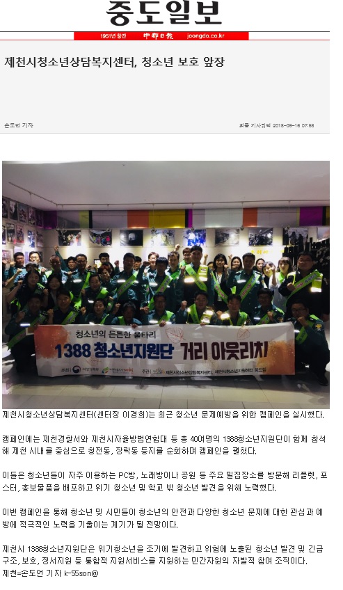 제천시청소년상담복지센터, 청소년 보호 앞장 페이지 정보 작성자 운영자 댓글 0건 조회 3,667회 작성일 18-09-17 10:57 본문 제천시청소년상담복지센터, 청소년 보호 앞장 목록 이전글제천시청소년상담복지센터, 청소년 보호 앞장 18.09.28 다음글제천청소년상담복지센터, 1388청소년지원단 야간 아웃리치 활동 18.09.17 댓글목록 댓글목록 등록된 댓글이 없습니다.