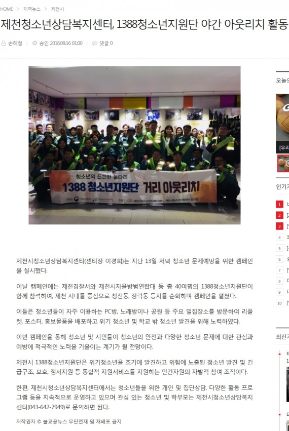 제천시청소년상담복지센터, 1388청소년지원단 야간 아웃리치 활동 페이지 정보 작성자 운영자 댓글 0건 조회 3,849회 작성일 18-09-28 09:23 본문 제천시청소년상담복지센터, 1388청소년지원단 야간 아웃리치 활동 목록 이전글1388청소년지원단 야간 아웃리치 캠페인 18.09.28 다음글제천시청소년상담복지센터, 청소년 보호 앞장 18.09.28 댓글목록 댓글목록 등록된 댓글이 없습니다.
