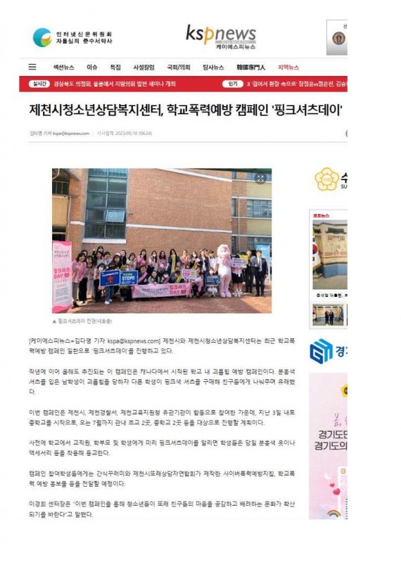 - 다음글제천시청소년상담복지센터, '핑크셔츠 데이' 운영 23.05.24