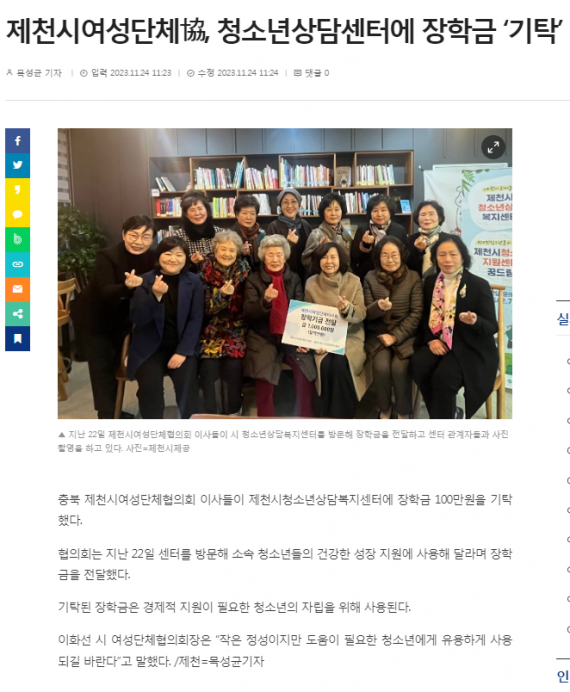 제천여성단체, 청소년상담센터에 장학금 '기탁' 페이지 정보 작성자 운영자 댓글 0건 조회 1,850회 작성일 23-11-27 10:18 본문 제천여성단체, 청소년상담센터에 장학금 '기탁' 목록 이전글제천시학교밖청소년지원센터, 목공체험지도사 자격증 취득반 운영 25.05.08 다음글제천시여성단체협의회 이사회, 장학금 전달 23.11.27 댓글목록 댓글목록 등록된 댓글이 없습니다.