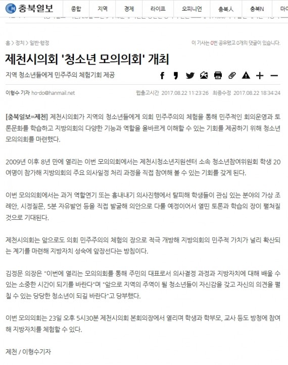 제천시의회 '청소년 모의의회'개최 페이지 정보 작성자 운영자 댓글 0건 조회 3,723회 작성일 17-08-29 11:00 본문 제천시의회 '청소년 모의의회'개최 목록 이전글제천시의회, 23일 청소년 모의의회 열어 17.08.29 다음글제천시의회, 8년만에 '청소년 모의의회'연다 17.08.29 댓글목록 댓글목록 등록된 댓글이 없습니다.