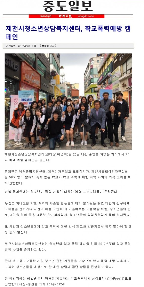 제천시청소년상담복지센터 학교폭력예방 캠페인 페이지 정보 작성자 운영자 댓글 0건 조회 3,823회 작성일 17-08-29 11:01 본문 제천시청소년상담복지센터 학교폭력예방 캠페인 관련링크 http://www.joongdo.co.kr/jsp/article/article_view.jsp?pq=201708241299 1928회 연결 목록 이전글교복입은 10대들 지방의원 되다 17.08.29 다음글제천시의회, 23일 청소년 모의의회 열어 17.08.29 댓글목록 댓글목록 등록된 댓글이 없습니다.