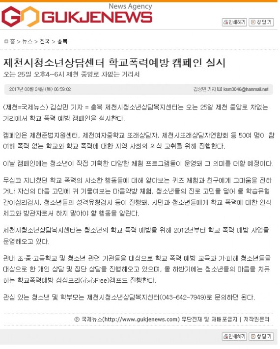 제천시청소년상담복지센터 학교폭력예방 캠페인 실시 페이지 정보 작성자 운영자 댓글 0건 조회 3,746회 작성일 17-08-29 11:02 본문 제천시청소년상담복지센터 학교폭력예방 캠페인 실시 관련링크 http://www.gukjenews.com/news/articleView.html?idxno=770240 1881회 연결 목록 이전글제천시청소년상담복지센터-1388청소년지원단, 야간아웃리치 17.10.19 다음글교복입은 10대들 지방의원 되다 17.08.29 댓글목록 댓글목록 등록된 댓글이 없습니다.