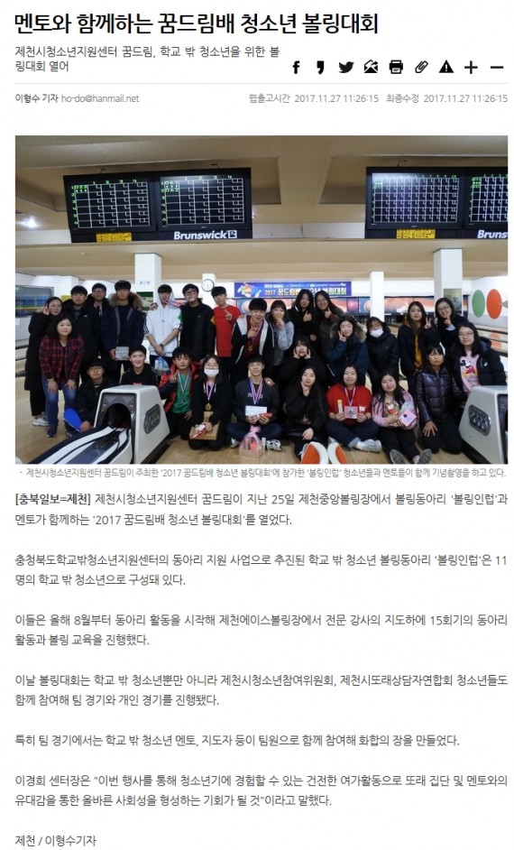 멘토와 함께하는 꿈드림배 청소년 볼링대회 페이지 정보 작성자 운영자 댓글 0건 조회 3,893회 작성일 17-11-27 18:52 본문 멘토와 함께하는 꿈드림배 청소년 볼링대회 목록 이전글제천시청소년지원센터 꿈드림, 학교 밖 청소년을 위한 볼링대회 열어 17.11.27 다음글제천시의회, 청소년 모의의회 개최 17.10.19 댓글목록 댓글목록 등록된 댓글이 없습니다.