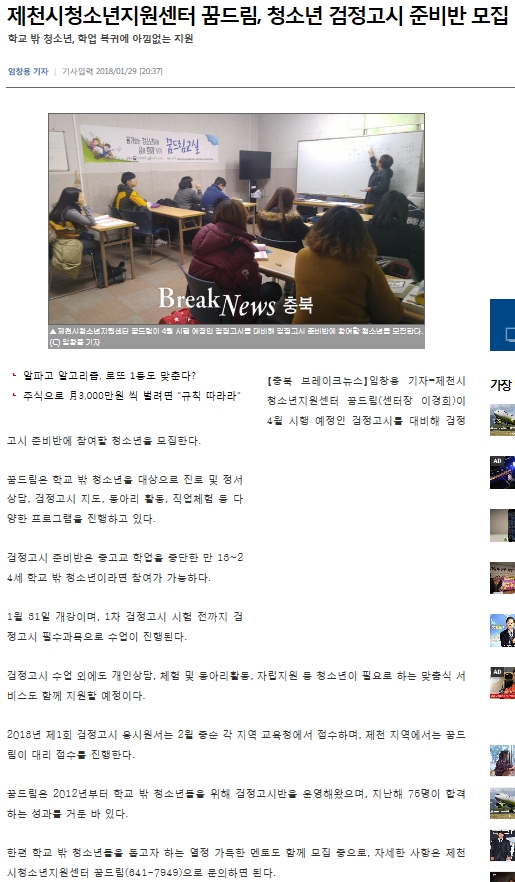 제천시청소년지원센터 꿈드림, 청소년 검정고시 준비반 모집 페이지 정보 작성자 운영자 댓글 0건 조회 3,825회 작성일 18-02-05 16:33 본문 제천시청소년지원센터 꿈드림, 청소년 검정고시 준비반 모집 목록 이전글검정고시 준비반 청소년 모집 18.02.05 다음글제천시청소년지원센터 꿈드림, 학교 밖 청소년을 위한 볼링대회 열어 17.11.27 댓글목록 댓글목록 등록된 댓글이 없습니다.