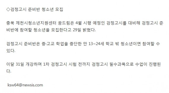 검정고시 준비반 청소년 모집 페이지 정보 작성자 운영자 댓글 0건 조회 3,725회 작성일 18-02-05 16:33 본문 검정고시 준비반 청소년 모집 목록 이전글제천시청소년지원센터 꿈드림 검정고시 준비반 모집 18.02.05 다음글제천시청소년지원센터 꿈드림, 청소년 검정고시 준비반 모집 18.02.05 댓글목록 댓글목록 등록된 댓글이 없습니다.