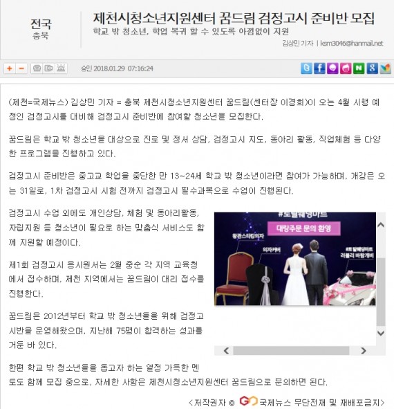 제천시청소년지원센터 꿈드림 검정고시 준비반 모집 페이지 정보 작성자 운영자 댓글 0건 조회 3,720회 작성일 18-02-05 16:34 본문 제천시청소년지원센터 꿈드림 검정고시 준비반 모집 목록 이전글제천시청소년지원센터 꿈드림 검정고시 청소년 모집 18.02.05 다음글검정고시 준비반 청소년 모집 18.02.05 댓글목록 댓글목록 등록된 댓글이 없습니다.