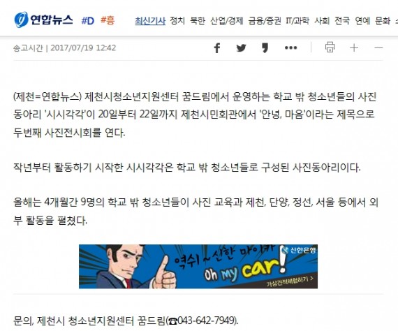 제천시 꿈드림 사진동아리'시시각각' 사진전시회 개최 페이지 정보 작성자 운영자 댓글 0건 조회 3,617회 작성일 17-07-24 18:03 본문 제천시 꿈드림 사진동아리'시시각각' 사진전시회 개최 목록 이전글제천시 꿈드림 사진전시회 '안녕, 마음' 개최 17.07.24 다음글제천시, 꿈드림 사진전시회 개최 17.07.24 댓글목록 댓글목록 등록된 댓글이 없습니다.