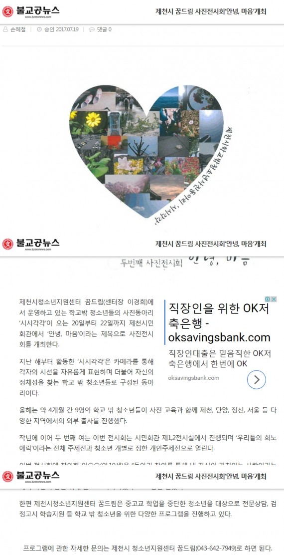제천시 꿈드림 사진전시회 '안녕, 마음' 개최 페이지 정보 작성자 운영자 댓글 0건 조회 3,606회 작성일 17-07-24 18:04 본문 제천시 꿈드림 사진전시회 '안녕, 마음' 개최 목록 이전글제천시 꿈드림 사진전시회 '안녕, 마음' 개최 17.07.24 다음글제천시 꿈드림 사진전시회 '안녕, 마음' 개최 17.07.24 댓글목록 댓글목록 등록된 댓글이 없습니다.