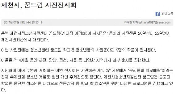 제천시 꿈드림 사진전시회 '안녕, 마음' 개최 페이지 정보 작성자 운영자 댓글 0건 조회 3,604회 작성일 17-07-24 18:05 본문 제천시 꿈드림 사진전시회 '안녕, 마음' 개최 목록 이전글제천시청소년상담복지센터, 학교폭력예방 프로그램 운영 17.08.29 다음글제천시 꿈드림 사진전시회 '안녕, 마음' 개최 17.07.24 댓글목록 댓글목록 등록된 댓글이 없습니다.