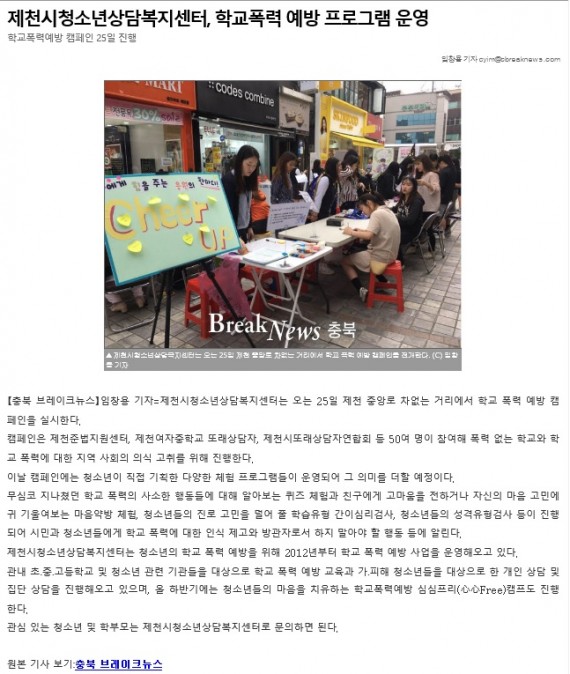제천시청소년상담복지센터, 학교폭력예방 프로그램 운영 페이지 정보 작성자 운영자 댓글 0건 조회 3,650회 작성일 17-08-29 10:47 본문 제천시청소년상담복지센터, 학교폭력예방 프로그램 운영 관련링크 http://www.breaknews.com/sub_read.html?uid=526481§ion=sc2# 1874회 연결 목록 이전글제천시청소년상담복지센터, 학교폭력예방 캠페인 17.08.29 다음글제천시 꿈드림 사진전시회 '안녕, 마음' 개최 17.07.24 댓글목록 댓글목록 등록된 댓글이 없습니다.