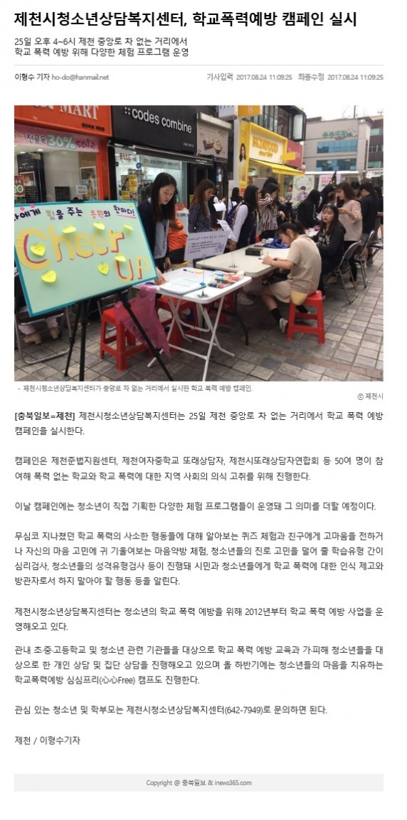 제천시청소년상담복지센터, 학교폭력예방 캠페인 실시 페이지 정보 작성자 운영자 댓글 0건 조회 3,532회 작성일 17-08-29 10:53 본문 제천시청소년상담복지센터, 학교폭력예방 캠페인 실시 관련링크 http://www.inews365.com/news/article.html?no=505546 1910회 연결 목록 이전글제천시광명시 청소년 지역교류 행사 열어 17.08.29 다음글제천시.광명시 청소년 지역교류 행사 실시 17.08.29 댓글목록 댓글목록 등록된 댓글이 없습니다.