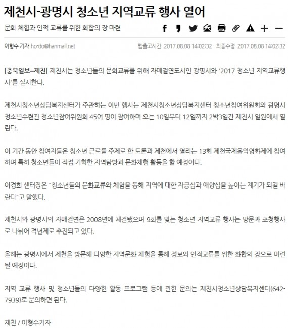 제천시광명시 청소년 지역교류 행사 열어 페이지 정보 작성자 운영자 댓글 0건 조회 3,651회 작성일 17-08-29 10:55 본문 제천시광명시 청소년 지역교류 행사 열어 목록 이전글제천시청소년상담복지센터, 학교폭력예방 캠페인 실시 17.08.29 다음글제천시청소년상담복지센터, 학교폭력예방 캠페인 실시 17.08.29 댓글목록 댓글목록 등록된 댓글이 없습니다.