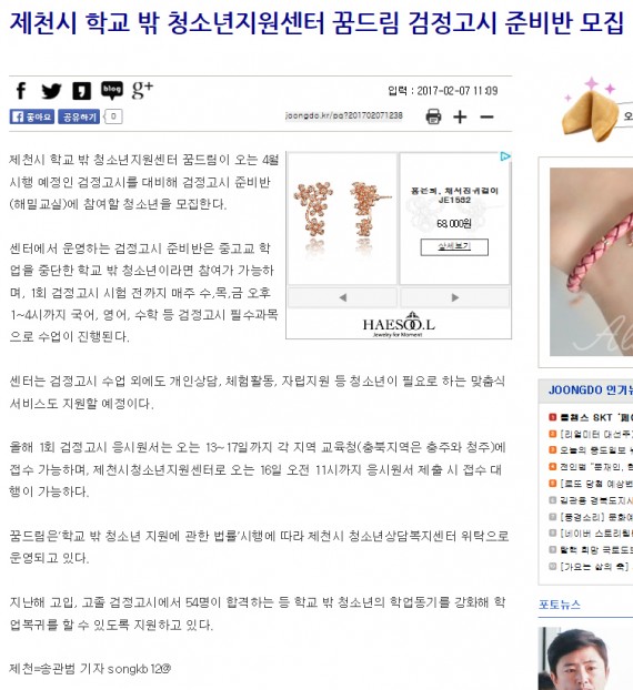 제천시 학교 밖 청소년지원센터 꿈드림 검정고시 준비반 모집 페이지 정보 작성자 운영자 댓글 0건 조회 3,893회 작성일 17-02-07 11:59 본문 제천시 학교 밖 청소년지원센터 꿈드림 검정고시 준비반 모집 목록 이전글제천시청소년지원센터, 검정고시 준비 청소년 '모집' 17.02.08 다음글제천 꿈드림 검정고시 준비반 모집 17.02.07 댓글목록 댓글목록 등록된 댓글이 없습니다.