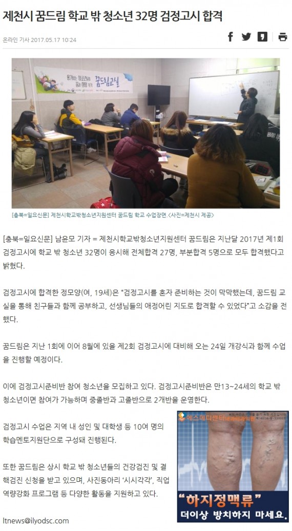 제천시 꿈드림 학교 밖 청소년 32명 검정고시 합격 페이지 정보 작성자 운영자 댓글 0건 조회 4,055회 작성일 17-05-18 10:51 본문 제천시 꿈드림 학교 밖 청소년 32명 검정고시 합격 목록 이전글제천시 학교 밖 청소년 32명 검정고시 합격 17.05.18 다음글청소년지원센터 '꿈드림' 검정고시 준비반 참여자 모집 17.02.08 댓글목록 댓글목록 등록된 댓글이 없습니다.