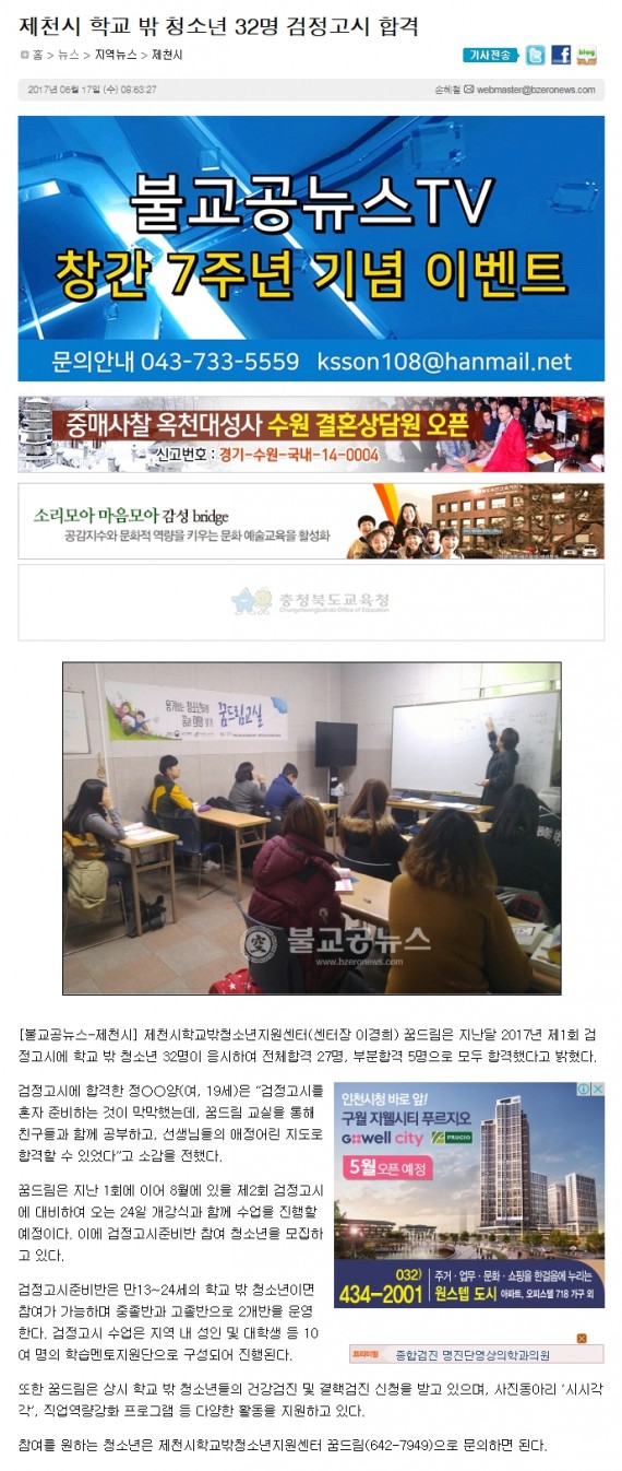 제천시 학교 밖 청소년 32명 검정고시 합격 페이지 정보 작성자 운영자 댓글 0건 조회 4,020회 작성일 17-05-18 10:51 본문 제천시 학교 밖 청소년 32명 검정고시 합격 목록 이전글제천시 꿈드림 학교 밖 청소년 32명 검정고시 합격 17.05.18 다음글제천시 꿈드림 학교 밖 청소년 32명 검정고시 합격 17.05.18 댓글목록 댓글목록 등록된 댓글이 없습니다.