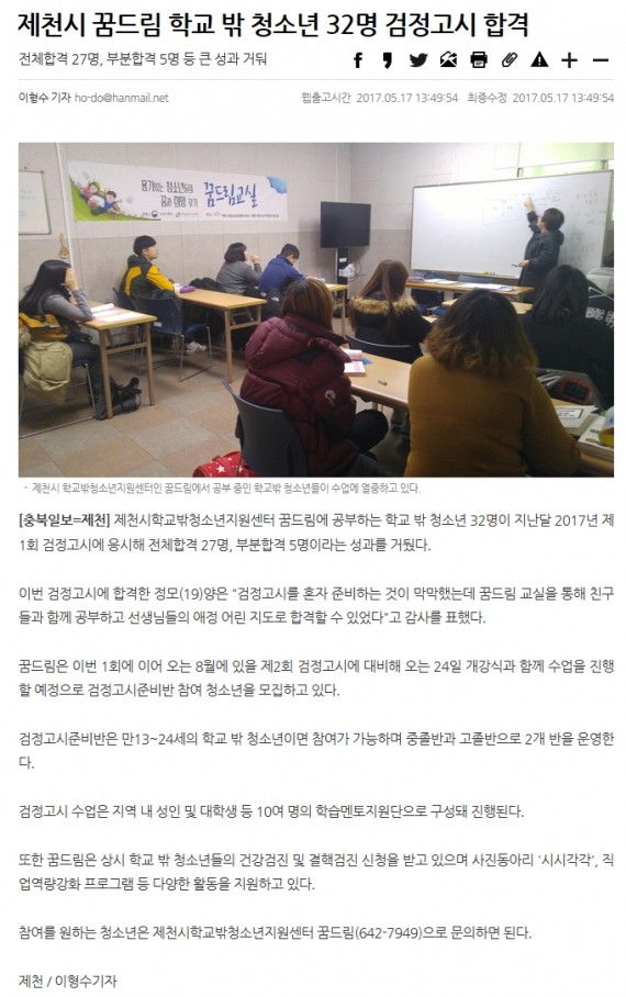 제천시 꿈드림 학교 밖 청소년 32명 검정고시 합격 페이지 정보 작성자 운영자 댓글 0건 조회 4,136회 작성일 17-05-18 10:52 본문 제천시 꿈드림 학교 밖 청소년 32명 검정고시 합격 목록 이전글제천시 꿈드림 학교 밖 청소년 32명 검정고시 합격 17.05.18 다음글제천시 학교 밖 청소년 32명 검정고시 합격 17.05.18 댓글목록 댓글목록 등록된 댓글이 없습니다.