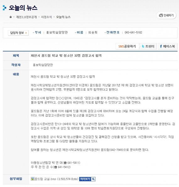 제천시 꿈드림 학교 밖 청소년 32명 검정고시 합격 페이지 정보 작성자 운영자 댓글 0건 조회 4,208회 작성일 17-05-18 10:53 본문 제천시 꿈드림 학교 밖 청소년 32명 검정고시 합격 목록 이전글제천시, 학교 밖 청소년 직업역량강화프로그램 큰 호응 17.07.24 다음글제천시 꿈드림 학교 밖 청소년 32명 검정고시 합격 17.05.18 댓글목록 댓글목록 등록된 댓글이 없습니다.