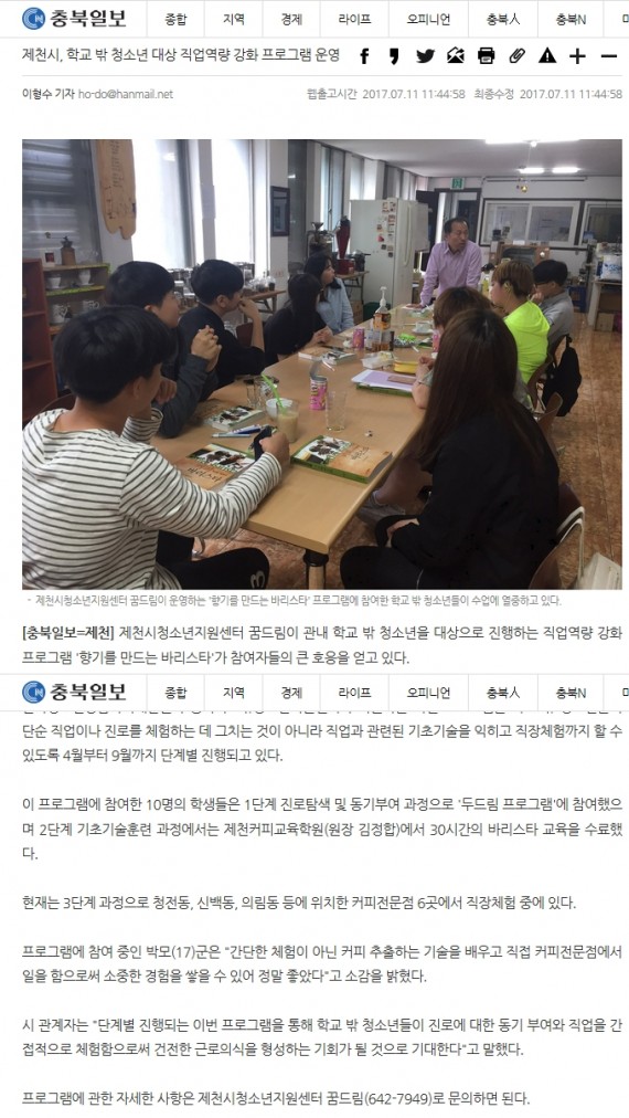 제천시, 학교 밖 청소년 대상 '직업역량강화 프로그램' 운영 페이지 정보 작성자 운영자 댓글 0건 조회 3,969회 작성일 17-07-24 17:56 본문 제천시, 학교 밖 청소년 대상 '직업역량강화 프로그램' 운영 목록 이전글제천시, '향기를만드는 바리스타' 큰 호응 17.07.24 다음글제천시청소년지원센터, '향기를 만드는 바리스타' 큰 호응 17.07.24 댓글목록 댓글목록 등록된 댓글이 없습니다.