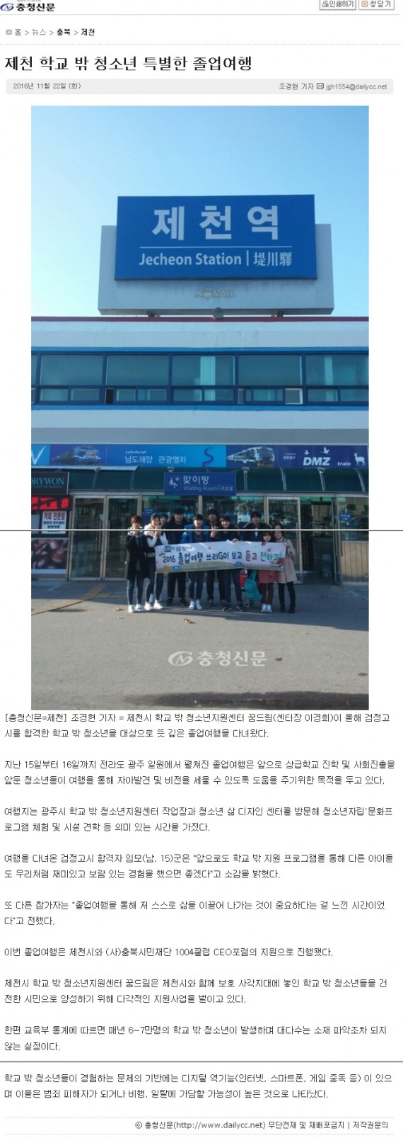 제천 학교 밖 청소년 특별한 졸업여행 페이지 정보 작성자 운영자 댓글 0건 조회 3,777회 작성일 16-11-23 09:58 본문 제천 학교 밖 청소년 특별한 졸업여행 목록 이전글제천시 학교 밖 청소년들 졸업여행 다녀와 16.11.23 다음글제천시 학교 밖 청소년 사진전 개최 16.11.03 댓글목록 댓글목록 등록된 댓글이 없습니다.