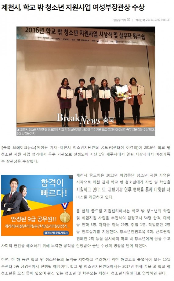 제천시, 학교 밖 청소년 지원사업 여성부장관상 수상 페이지 정보 작성자 운영자 댓글 0건 조회 3,832회 작성일 16-12-07 15:08 본문 제천시, 학교 밖 청소년 지원사업 여성부장관상 수상 목록 이전글제천시, 청소년지원센터 '꿈드림' 여가부장관상 수상 16.12.07 다음글제천시 학교 밖 청소년, 쓰리GO! 졸업여행 16.11.23 댓글목록 댓글목록 등록된 댓글이 없습니다.