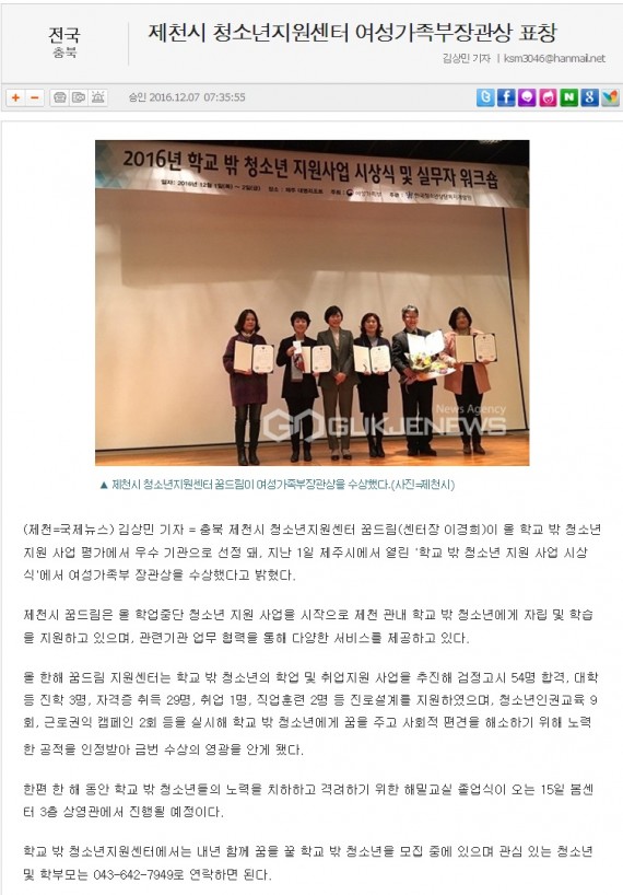 제천시 청소년지원센터 여성가족부장관상 표창 페이지 정보 작성자 운영자 댓글 0건 조회 4,141회 작성일 16-12-07 15:14 본문 제천시 청소년지원센터 여성가족부장관상 표창 목록 이전글제천시 청소년지원센터 꿈드림, 여성가족부장관상 표창 16.12.07 다음글제천시청소년지원센터, 여성부장관상 '수상' 16.12.07 댓글목록 댓글목록 등록된 댓글이 없습니다.