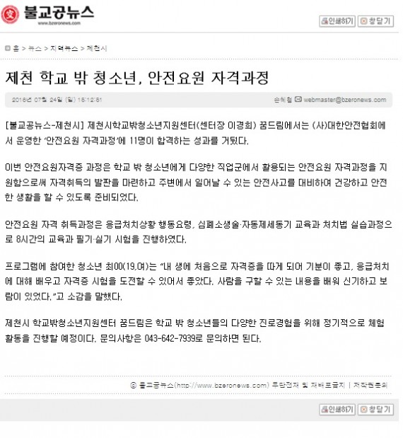 제천 학교 밖 청소년, 안전요원 자격과정 페이지 정보 작성자 운영자 댓글 0건 조회 3,842회 작성일 16-11-03 14:11 본문 제천 학교 밖 청소년, 안전요원 자격과정 목록 이전글제천시 학교 밖 청소년, '안전요원 자격증 취득' 16.11.03 다음글제천시 '꿈드림' 학교 밖 청소년 21명 검정고시 '합격' 16.11.03 댓글목록 댓글목록 등록된 댓글이 없습니다.