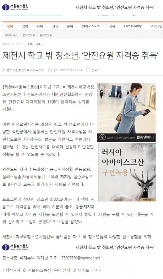 제천시 학교 밖 청소년, '안전요원 자격증 취득' 페이지 정보 작성자 운영자 댓글 0건 조회 3,974회 작성일 16-11-03 14:12 본문 제천시 학교 밖 청소년, '안전요원 자격증 취득' 목록 이전글제천시 학교밖 청소년 11명, 안전요원 자격증 획득 16.11.03 다음글제천 학교 밖 청소년, 안전요원 자격과정 16.11.03 댓글목록 댓글목록 등록된 댓글이 없습니다.