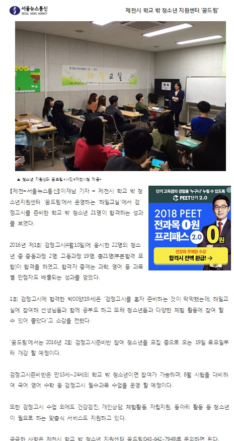 제천시 학교 밖 청소년 지원센터 '꿈드림' 페이지 정보 작성자 운영자 댓글 0건 조회 3,839회 작성일 16-11-03 14:49 본문 제천시 학교 밖 청소년 지원센터 '꿈드림' 목록 이전글제천시, 학교 밖 청소년 선도 행사 16.11.03 다음글제천경찰서, '해밀교실'의 학교 밖 청소년들을 위한 행사 개최 16.11.03 댓글목록 댓글목록 등록된 댓글이 없습니다.