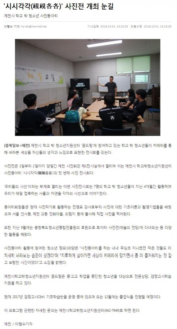 '시시각각(視視各各)' 사진전 개최 눈길 페이지 정보 작성자 운영자 댓글 0건 조회 3,648회 작성일 16-11-03 15:35 본문 '시시각각(視視各各)' 사진전 개최 눈길 목록 이전글제천시 학교 밖 청소년지원센터 내일부터 우리들의 시선 사진전 16.11.03 다음글제천경찰서 청소년선도심사위, 해밀교실에 책 '전달' 16.11.03 댓글목록 댓글목록 등록된 댓글이 없습니다.
