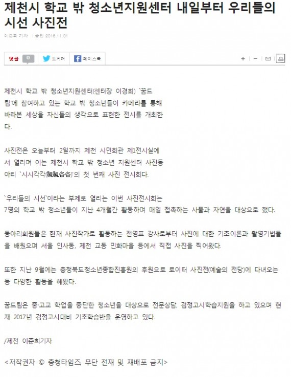 제천시 학교 밖 청소년지원센터 내일부터 우리들의 시선 사진전 페이지 정보 작성자 운영자 댓글 0건 조회 3,722회 작성일 16-11-03 15:42 본문 제천시 학교 밖 청소년지원센터 내일부터 우리들의 시선 사진전 목록 이전글제천시, 학교 밖 청소년 사진동아리 '시시각각(視視各各)' 사진전 개최 16.11.03 다음글'시시각각(視視各各)' 사진전 개최 눈길 16.11.03 댓글목록 댓글목록 등록된 댓글이 없습니다.