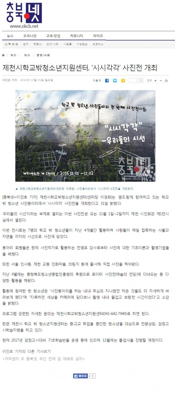 - 이전글제천시 학교 밖 청소년 사진동아리 '시시각각(視視各各)' 사진전 개최 16.11.03