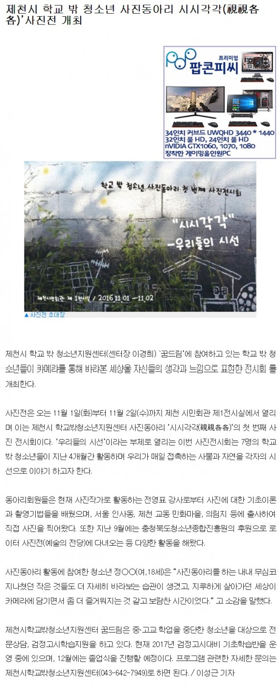 제천시 학교 밖 청소년 사진동아리 '시시각각(視視各各)' 사진전 개최 페이지 정보 작성자 운영자 댓글 0건 조회 3,781회 작성일 16-11-03 16:08 본문 제천시 학교 밖 청소년 사진동아리 '시시각각(視視各各)' 사진전 개최 목록 이전글청소년들이 보는 세상밖 사진동아리 '시시각각(視視各各)'사진전 16.11.03 다음글제천시 학교밖청소년지원센터, '시시각각' 사진전 개최 16.11.03 댓글목록 댓글목록 등록된 댓글이 없습니다.