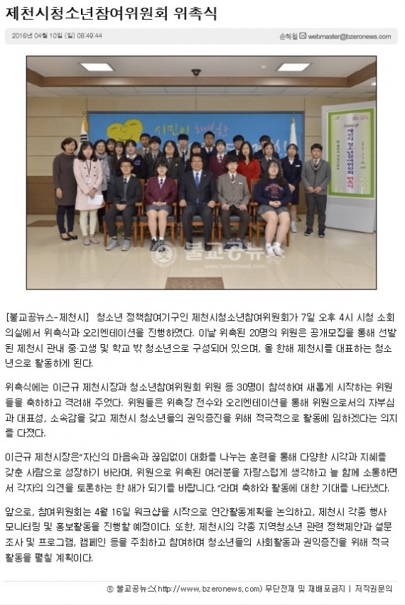 제천시청소년참여위원회 위촉식 페이지 정보 작성자 운영자 댓글 0건 조회 4,027회 작성일 16-04-22 17:56 본문 제천시청소년참여위원회 위촉식 관련링크 http://www.bzeronews.com/news/articleView.html?idxno=178129 2200회 연결 목록 이전글제천시 청소년참여위원회 위촉식 개최 16.04.22 다음글제천시청소년상담복지센터, 여성가족부 장관상 표창 16.03.08 댓글목록 댓글목록 등록된 댓글이 없습니다.