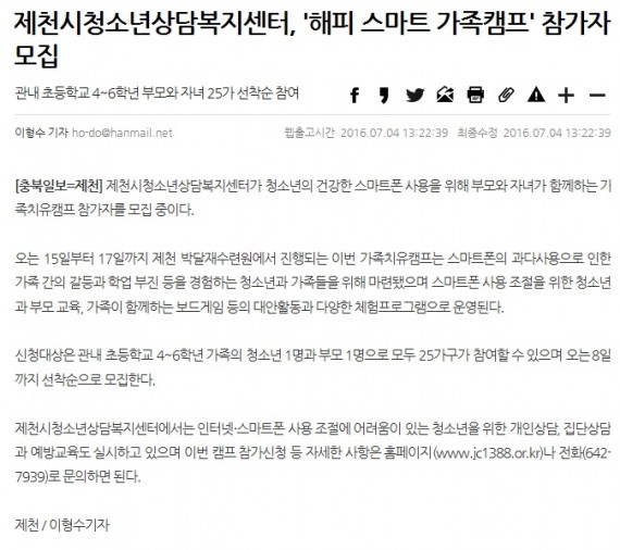 제천시청소년상담복지센터 해피! 스마트 가족캠프 참가자 모집 페이지 정보 작성자 운영자 댓글 0건 조회 4,461회 작성일 16-07-19 15:34 본문 제천시청소년상담복지센터 해피! 스마트 가족캠프 참가자 모집 목록 이전글제천시청소년상담복지센터, 광명시와 교류 16.08.24 다음글충주시 남자 청소년쉼터-충주·제천·음성 청소년복지센터, 업무협약 16.07.19 댓글목록 댓글목록 등록된 댓글이 없습니다.
