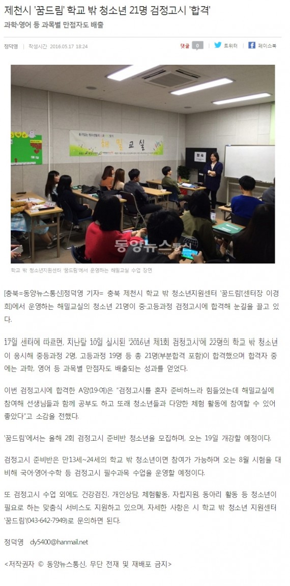 제천시 '꿈드림' 학교 밖 청소년 21명 검정고시 '합격' 페이지 정보 작성자 운영자 댓글 0건 조회 3,956회 작성일 16-11-03 14:10 본문 제천시 '꿈드림' 학교 밖 청소년 21명 검정고시 '합격' 목록 이전글제천 학교 밖 청소년, 안전요원 자격과정 16.11.03 다음글제천시 학교밖 청소년, 검정고시 대거 합격 16.11.03 댓글목록 댓글목록 등록된 댓글이 없습니다.