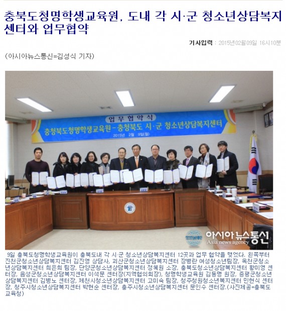 충북도청명학생교육원, 도내 각 시.군 청소년상담복지센터와 업무협약 페이지 정보 작성자 운영자 댓글 0건 조회 4,010회 작성일 15-04-07 09:30 본문 충북도청명학생교육원, 도내 각 시.군 청소년상담복지센터와 업무협약 목록 이전글제천시 학교 밖 청소년, 검정고시 대거 합격 15.05.19 다음글제천시청소년상담복지센터 우수기관 선정 15.01.05 댓글목록 댓글목록 등록된 댓글이 없습니다.