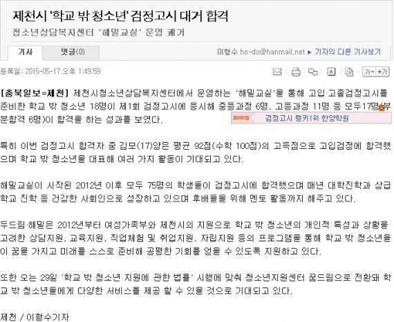 제천시 '학교 밖 청소년' 검정고시 대거 합격 페이지 정보 작성자 운영자 댓글 0건 조회 4,009회 작성일 15-05-19 14:34 본문 제천시 '학교 밖 청소년' 검정고시 대거 합격 목록 이전글제천시 학교 밖 청소년, 검정고시 대거 합격 15.05.19 다음글제천시 학교 밖 청소년, 검정고시 대거 합격 15.05.19 댓글목록 댓글목록 등록된 댓글이 없습니다.