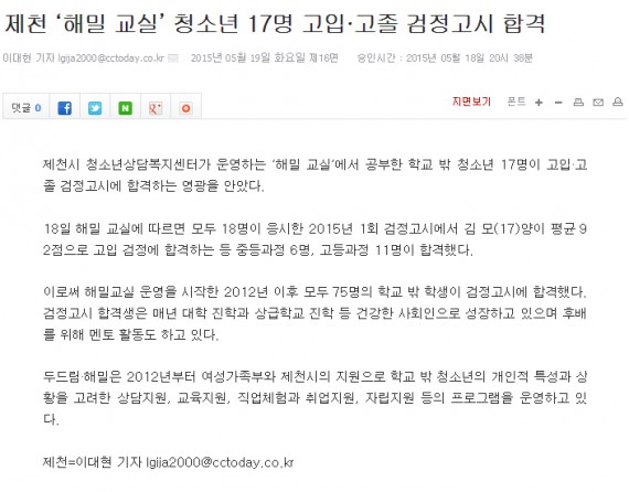제천 '해밀 교실' 청소년 17명 고입.고졸 검정고시 합격 페이지 정보 작성자 운영자 댓글 0건 조회 4,240회 작성일 15-05-19 14:36 본문 제천 '해밀 교실' 청소년 17명 고입.고졸 검정고시 합격 목록 이전글제천시 청소년 검정고시 대거 합격 15.05.19 다음글제천시 학교 밖 청소년, 검정고시 대거 합격 15.05.19 댓글목록 댓글목록 등록된 댓글이 없습니다.
