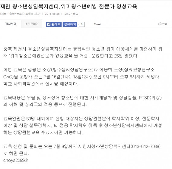 제천 청소년상담복지센터, 위기청소년예방 전문가 양성교육 페이지 정보 작성자 운영자 댓글 0건 조회 4,091회 작성일 15-07-21 11:33 본문 제천 청소년상담복지센터, 위기청소년예방 전문가 양성교육 목록 이전글제천시 위기청소년예방 전문가 양성교육 실시 15.07.21 다음글제천시 청소년 검정고시 대거 합격 15.05.19 댓글목록 댓글목록 등록된 댓글이 없습니다.