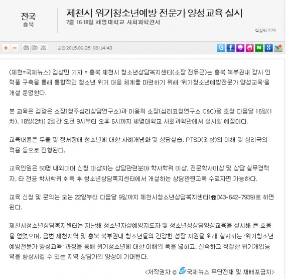 제천시 위기청소년예방 전문가 양성교육 실시 페이지 정보 작성자 운영자 댓글 0건 조회 4,362회 작성일 15-07-21 11:34 본문 제천시 위기청소년예방 전문가 양성교육 실시 목록 이전글제천시, 위기청소년예방 전문가 양성교육 실시 15.07.21 다음글제천 청소년상담복지센터, 위기청소년예방 전문가 양성교육 15.07.21 댓글목록 댓글목록 등록된 댓글이 없습니다.