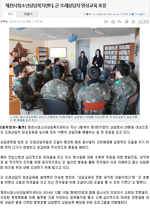 제천시청소년상담복지센터, 군 또래상담자 양성교육 호응 페이지 정보 작성자 운영자 댓글 0건 조회 4,336회 작성일 15-07-21 11:35 본문 제천시청소년상담복지센터, 군 또래상담자 양성교육 호응 목록 이전글5탄약창 軍 또래상담자 양성교육 15.07.21 다음글제천시, 위기청소년예방 전문가 양성교육 실시 15.07.21 댓글목록 댓글목록 등록된 댓글이 없습니다.