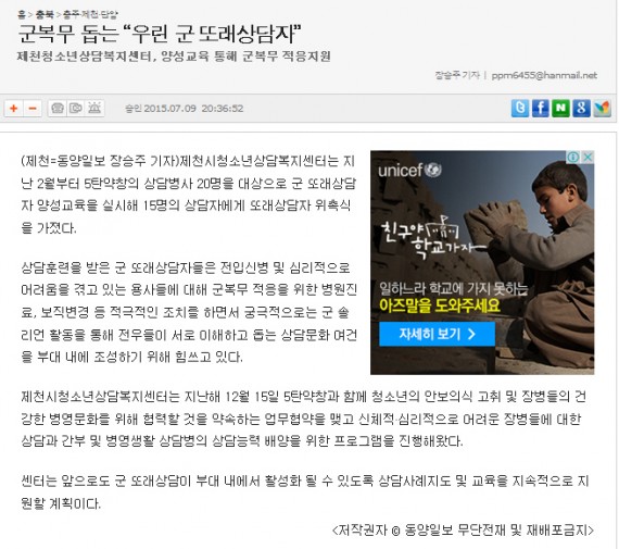군복무 돕는 "우린 군 또래상담자" 페이지 정보 작성자 운영자 댓글 0건 조회 4,376회 작성일 15-07-21 11:37 본문 군복무 돕는 "우린 군 또래상담자" 목록 이전글해밀교실 검정고시준비반 개강 및 참여 청소년 모집 16.03.08 다음글5탄약창 軍 또래상담자 양성교육 15.07.21 댓글목록 댓글목록 등록된 댓글이 없습니다.