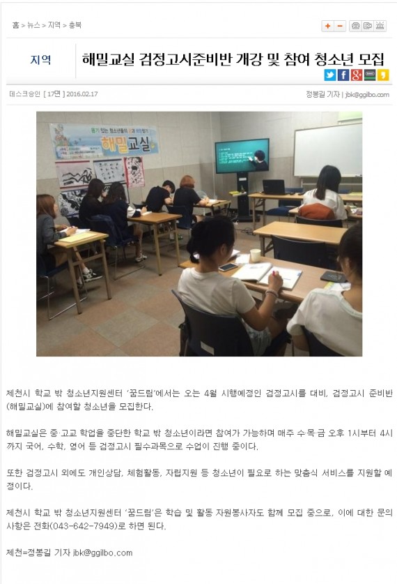 해밀교실 검정고시준비반 개강 및 참여 청소년 모집 페이지 정보 작성자 운영자 댓글 0건 조회 4,094회 작성일 16-03-08 14:24 본문 해밀교실 검정고시준비반 개강 및 참여 청소년 모집 목록 이전글제천시 학교 밖 청소년지원센터「꿈드림」, 해밀교실 검정고시준비반 개강 및 참여 청소년 모집 16.03.08 다음글군복무 돕는 "우린 군 또래상담자" 15.07.21 댓글목록 댓글목록 등록된 댓글이 없습니다.