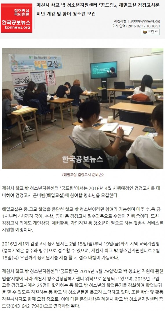 제천시 학교 밖 청소년지원센터「꿈드림」, 해밀교실 검정고시준비반 개강 및 참여 청소년 모집