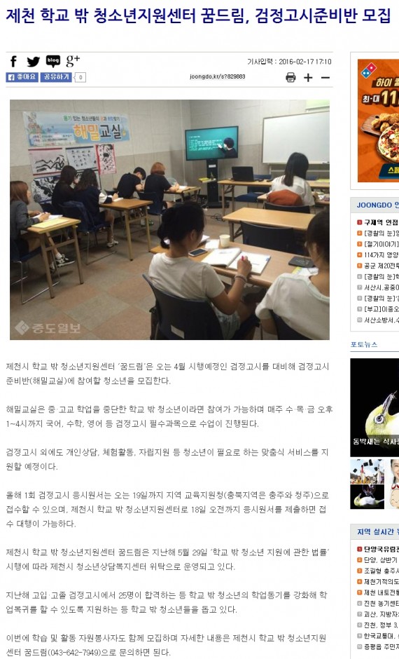 제천시 학교 밖 청소년지원센터꿈드림, 검정고시준비반 모집 페이지 정보 작성자 운영자 댓글 0건 조회 4,148회 작성일 16-03-08 14:25 본문 제천시 학교 밖 청소년지원센터꿈드림, 검정고시준비반 모집 목록 이전글제천시청소년참여위원회 모집 16.03.08 다음글제천시 학교 밖 청소년지원센터「꿈드림」, 해밀교실 검정고시준비반 개강 및 참여 청소년 모집 16.03.08 댓글목록 댓글목록 등록된 댓글이 없습니다.