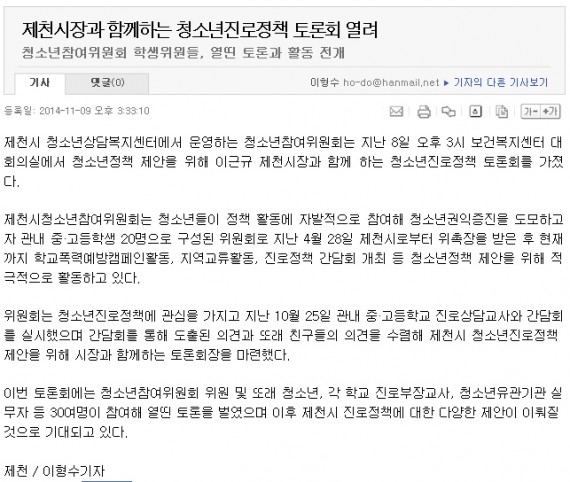 제천시장과 함께하는 청소년진로정책 토론회 열려 페이지 정보 작성자 운영자 댓글 0건 조회 3,968회 작성일 14-11-20 17:36 본문 제천시장과 함께하는 청소년진로정책 토론회 열려 목록 이전글학교폭력예방을 위한 '스위치를 켜라' 14.11.20 다음글제천시장과 함께하는 청소년진로정책 토론회 14.11.20 댓글목록 댓글목록 등록된 댓글이 없습니다.